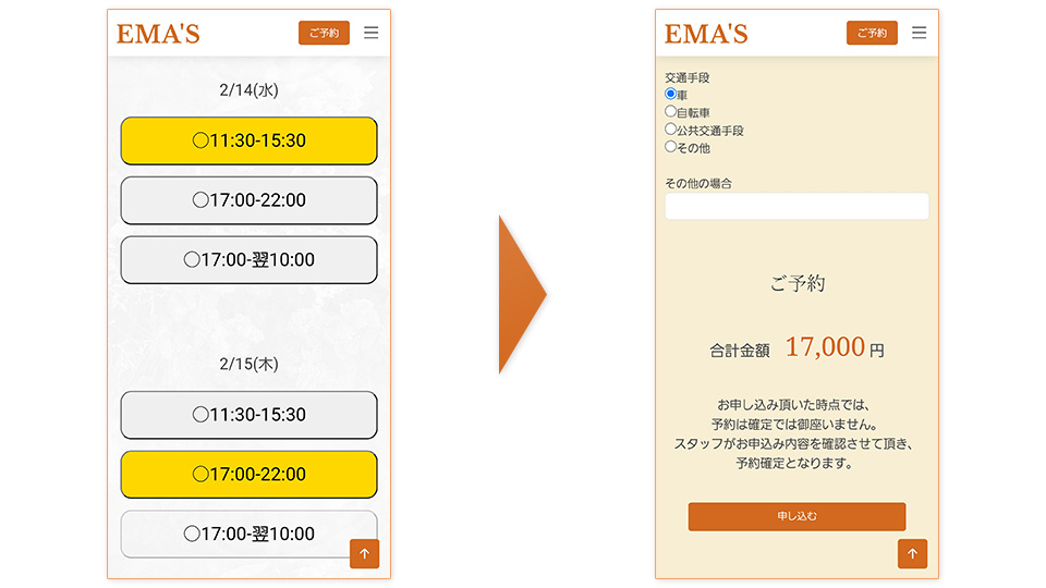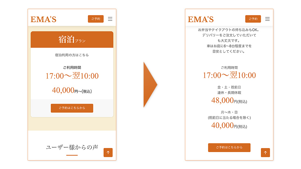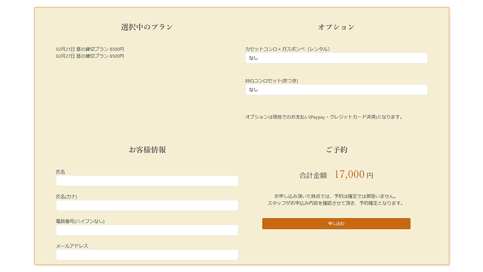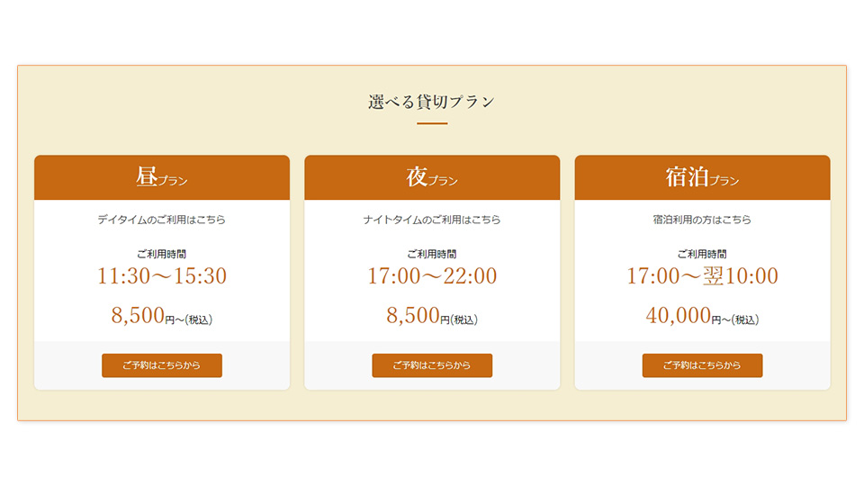 HPの各プランページより料金や内容を確認し、『ご予約はこちら』のボタンへ進みます