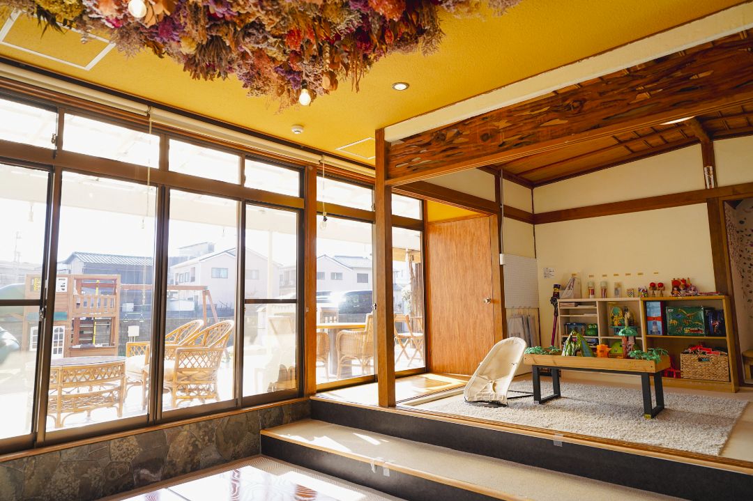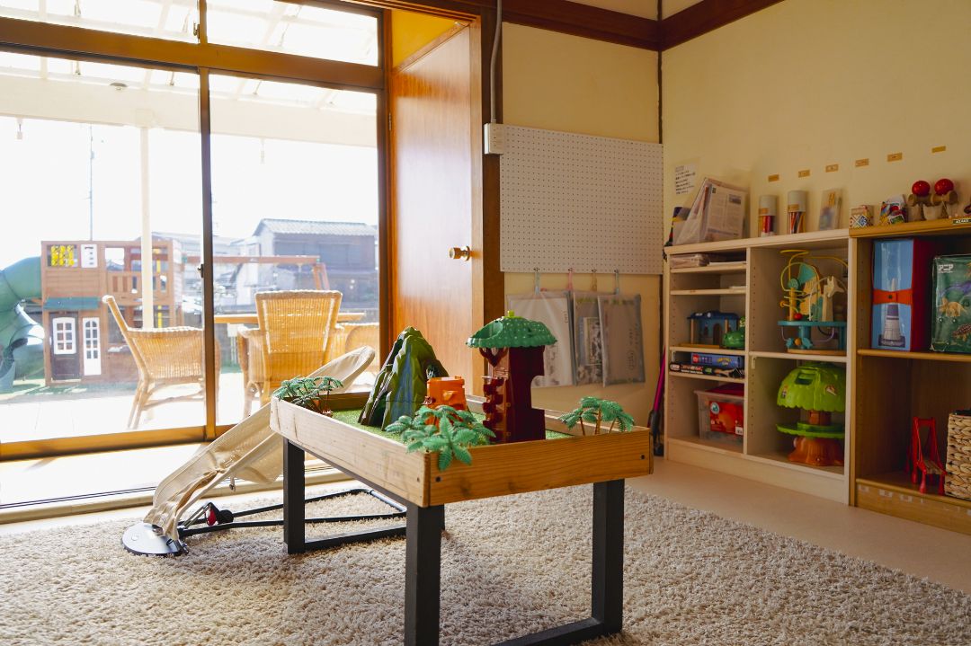 ・室内にはままごとハウスやままごとキッチン、組立レールとミニカー、恐竜や動物などのジオラマスペース、オセロやけん玉、お絵かき帳やホワイトボード、オセロやけん玉、絵本など、雨の日でも子供達が遊べるおもちゃが従実しています。