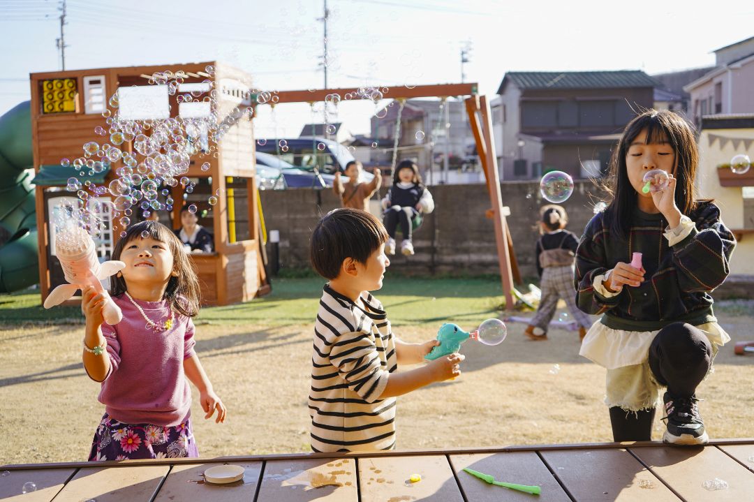 ・広大なお庭にはおままごとハウス、ブランコ、滑り台、キックボード、縄跳び、ホッピングスティックなどが充実しており、子供たちがお庭で思いっきり遊べます。